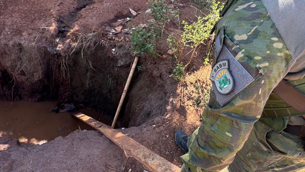 Através de denúncia, os policiais militares flagraram duas valas escavadas no solo, utilizadas para descarte ilegal de efluentes domésticos e outros rejeitos. As valas não possuíam qualquer tipo de impermeabilização, cobertura ou sistema de tratamento, desta forma contaminando o solo e trazendo riscos à saúde pública. Em uma das valas, a equipe do 3º BABM encontrou aves mortas.