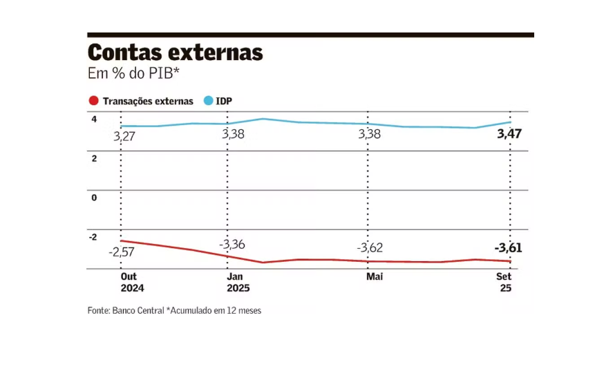 O Brasil está mandando mais dinheiro para fora do que recebendo — e isso preocupa o mercado. O motivo principal tem nome complicado, mas o efeito é simples: menos dólares no país. Esse “extrato” que mostra quanto o Brasil paga e recebe do resto do mundo se chama transações correntes. E, nos últimos 12 meses até setembro, ele ficou no vermelho em US$ 79 bilhões, o equivalente a 3,6% de tudo o que o país produz (PIB). O maior motivo são as remessas de lucros e dividendos — ou seja, o dinheiro que empresas estrangeiras lucram aqui e mandam de volta para seus países. Entre janeiro e setembro, US$ 39 bilhões saíram do Brasil só com isso — mais do que no mesmo período de 2024. Os brasileiros também estão gastando mais com serviços internacionais, como streamings, jogos, nuvem e apostas online. Cada assinatura, clique ou aposta também faz com que mais dólares saiam do país. Apesar da preocupação, o Banco Central diz que o Brasil ainda consegue equilibrar as contas porque está recebendo muitos investimentos estrangeiros diretos — foram US$ 10,7 bilhões em setembro e US$ 75,8 bilhões em 12 meses. Mesmo assim, analistas de bancos privados alertam: se essa tendência continuar, em 2025 o dinheiro que sai pode ser maior do que o que entra, algo que não acontece há 10 anos — e isso deixaria o Brasil mais vulnerável nas suas contas com o mundo.