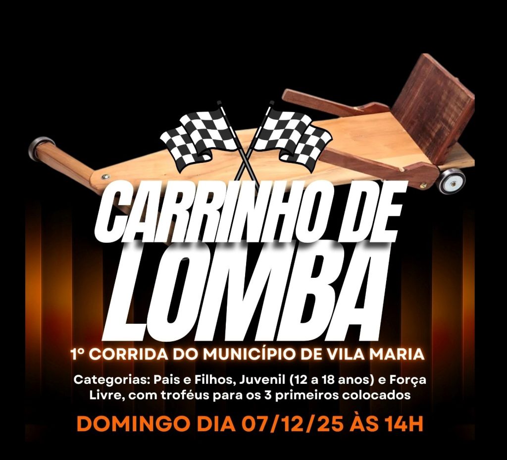 No dia 07 de dezembro, acontecerá pela primeira vez na história do município de Vila Maria, a Corrida de Carrinho de Lomba. O evento, que fará parte da programação natalina do município, está sendo organizado pela Coordenadoria de Esportes, e conta com o apoio da Câmara Municipal de Vereadores. A 1ª Corrida de Carrinho de Lomba de Vila Maria, terá como palco a Rua Irmãos Busato, em frente à Prefeitura Municipal, com início às 14 horas. As disputas serão realizadas em 03 categorias: Pais e Filhos Juvenil (12 a 18 anos) Força Livre (a partir de 18 anos) As inscrições podem ser realizadas de 03 a 28 de novembro, na Coordenadoria de Esportes, junto ao Ginásio Municipal. Haverá troféus para o 1º, 2º e 3º lugares de cada categoria. Haverá mateada no local, com erva mate e água quente distribuídas pela Ervateira Bernardon. Importante: • Menores de idade deverão apresentar termo de responsabilidade assinado pelos responsáveis; • É obrigatório o uso de equipamentos de segurança (capacete, joelheira, cotoveleira e calçado fechado); • Os carrinhos devem ser artesanais, feitos de rolimã ou pneu, e obrigatoriamente possuir freio. Realização: Administração Municipal de Vila Maria, por meio da Coordenadoria de Esportes. Apoio: Velharia Car Clube, Jeep Club Piratas do Tarimba, Motoclube Quebra Biela e Grupo de Gaioleiros e Embarados Off-Road de Vila Maria.