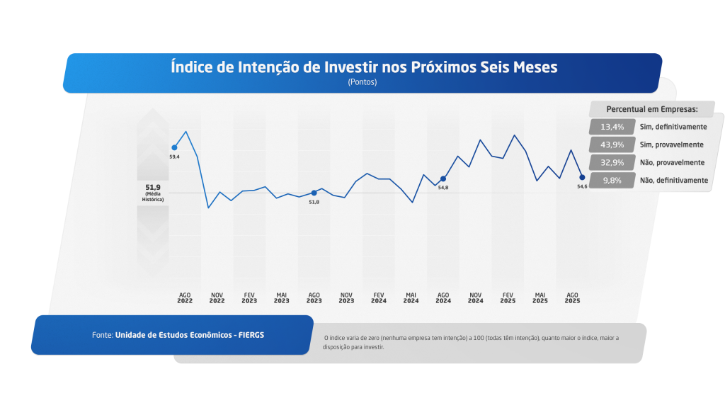 As tarifas de 50% impostas pelos Estados Unidos sobre produtos brasileiros estão freando a intenção de investir da indústria gaúcha. De acordo com a Pesquisa Sondagem Industrial, divulgada pela Unidade de Estudos Econômicos do Sistema FIERGS nesta terça-feira (2), o índice que mede a disposição dos industriais de investir nos próximos seis meses recuou de 59 pontos, em julho, para 54,6 em agosto.