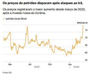 Brent: Saltou 9%, chegando a ultrapassar os US$ 80 — maior alta em 4 anos.