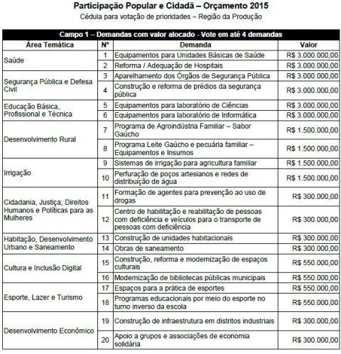 No primeiro campo de votação é possível escolher até quartro demandas e no segundo campo até duas prioridades regionais.