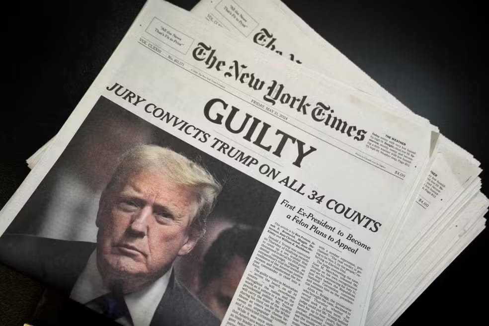 Trump vs. New York Times. O presidente americano abriu um processo de US$ 15 bilhões contra o New York Times, acusando o jornal de difamação. A ação cita artigos que diziam que ele não era apto ao cargo presidencial, além do livro Perdedor Sortudo, lançado em 2024. O jornal é avaliado em pouco menos de US$ 10 bi.